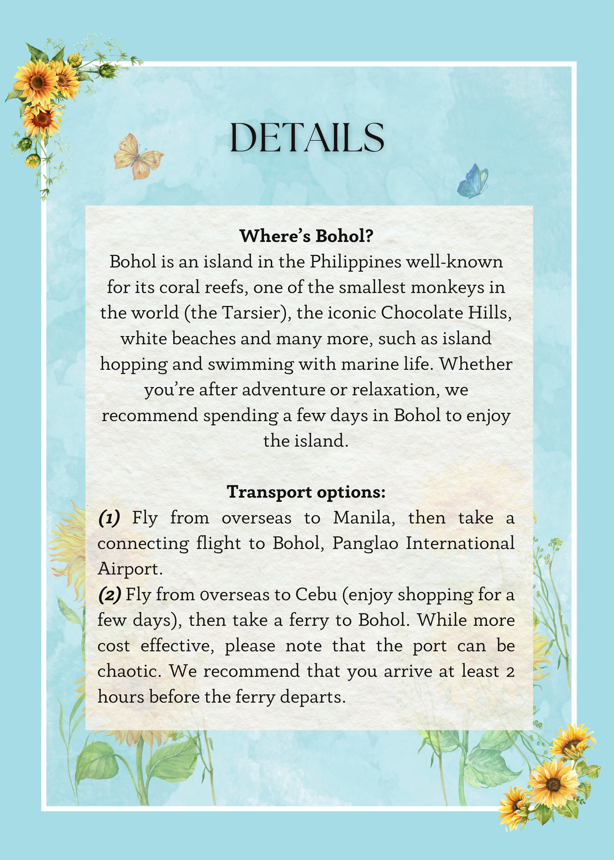 We’re so excited to welcome you to BOHOL! To make your trip as smooth and enjoyable as possible, we’ve put together a list of our recommended hotels and resorts nearby. Whether you’re looking for a cozy stay, a beachfront escape, or a luxurious getaway, there’s something for everyone.